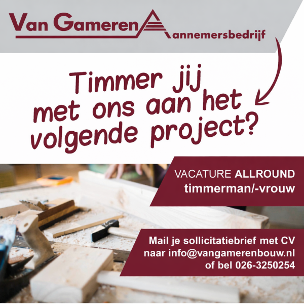 Van Gameren Aannemersbedrijf in Gendt zoekt een timmerman/-vrouw die zin heeft om mooie dingen te maken.